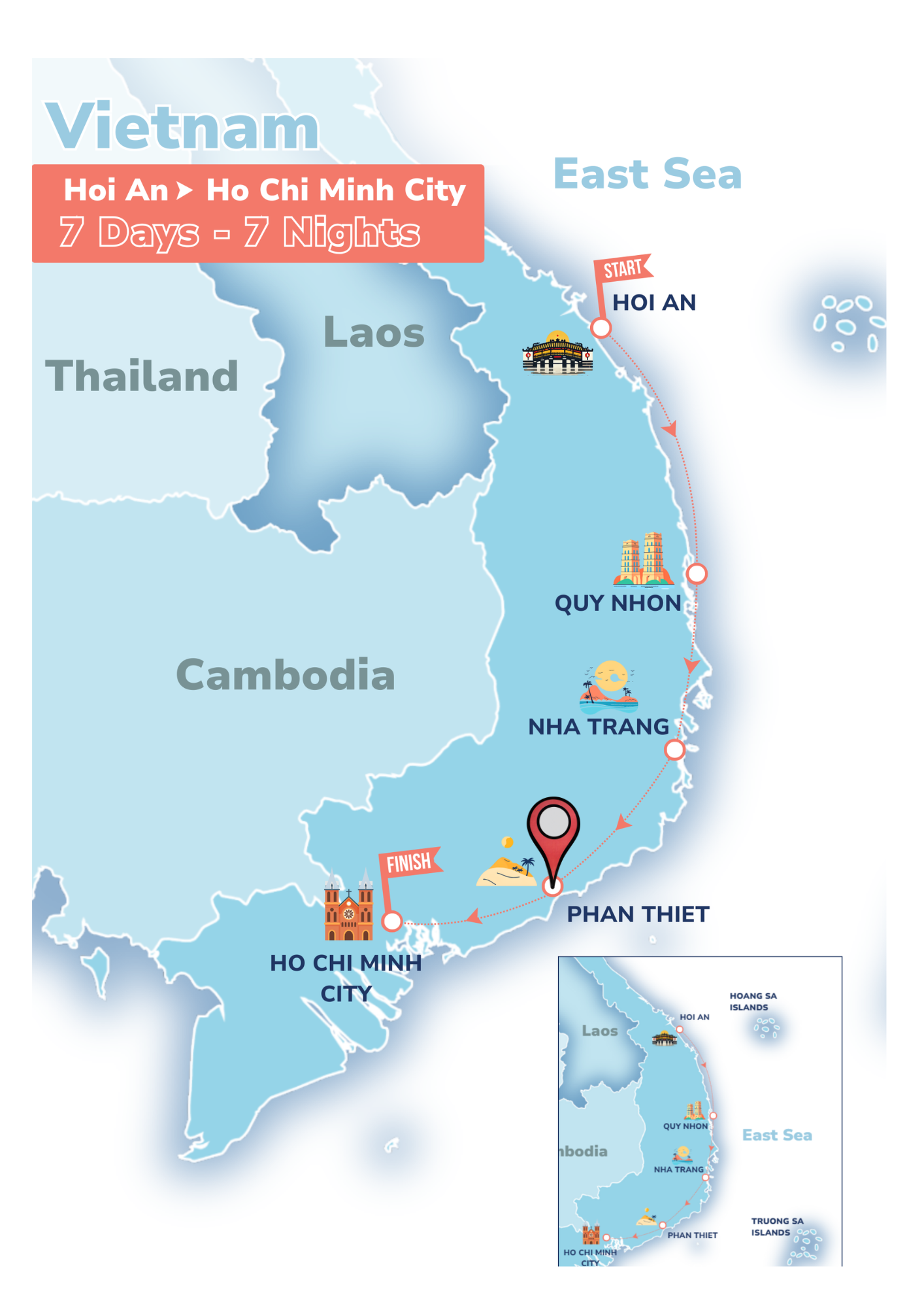 3. Hoi An – Ho Chi Minh City: This journey invites you to explore from the ancient town of Hoi An to the Vietnam Heroic Mother Monument in Quang Nam, and then to the Son My Memorial in Quang Ngai. Along the Central Coast, you will visit the coastal city of Quy Nhon to see the ancient Cham twin towers before enjoying the captivating sand dunes of Mui Ne.