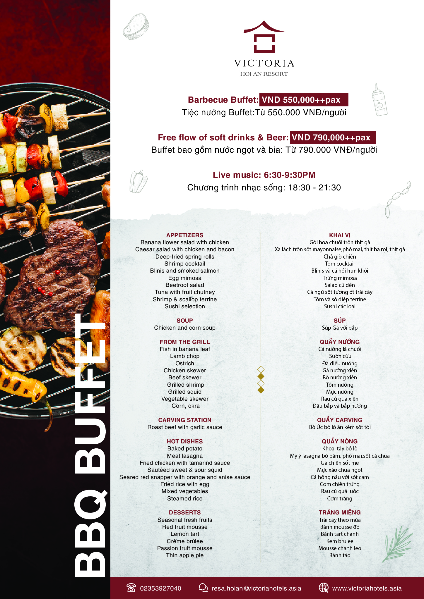 From exquisite flavors to eye-catching presentation, meals at the stylish L’Annam Restaurant on Cua Dai Beach aim to impress. The restaurant also hosts can’t-miss culinary events like the Hoi An Market Buffet every Tuesday night and the lively BBQ Buffet every Saturday night by the infinity pool. Delicious food accompanied by live music performances and traditional dances with a modern twist combine for unforgettable evenings in beautiful Hoi An.
