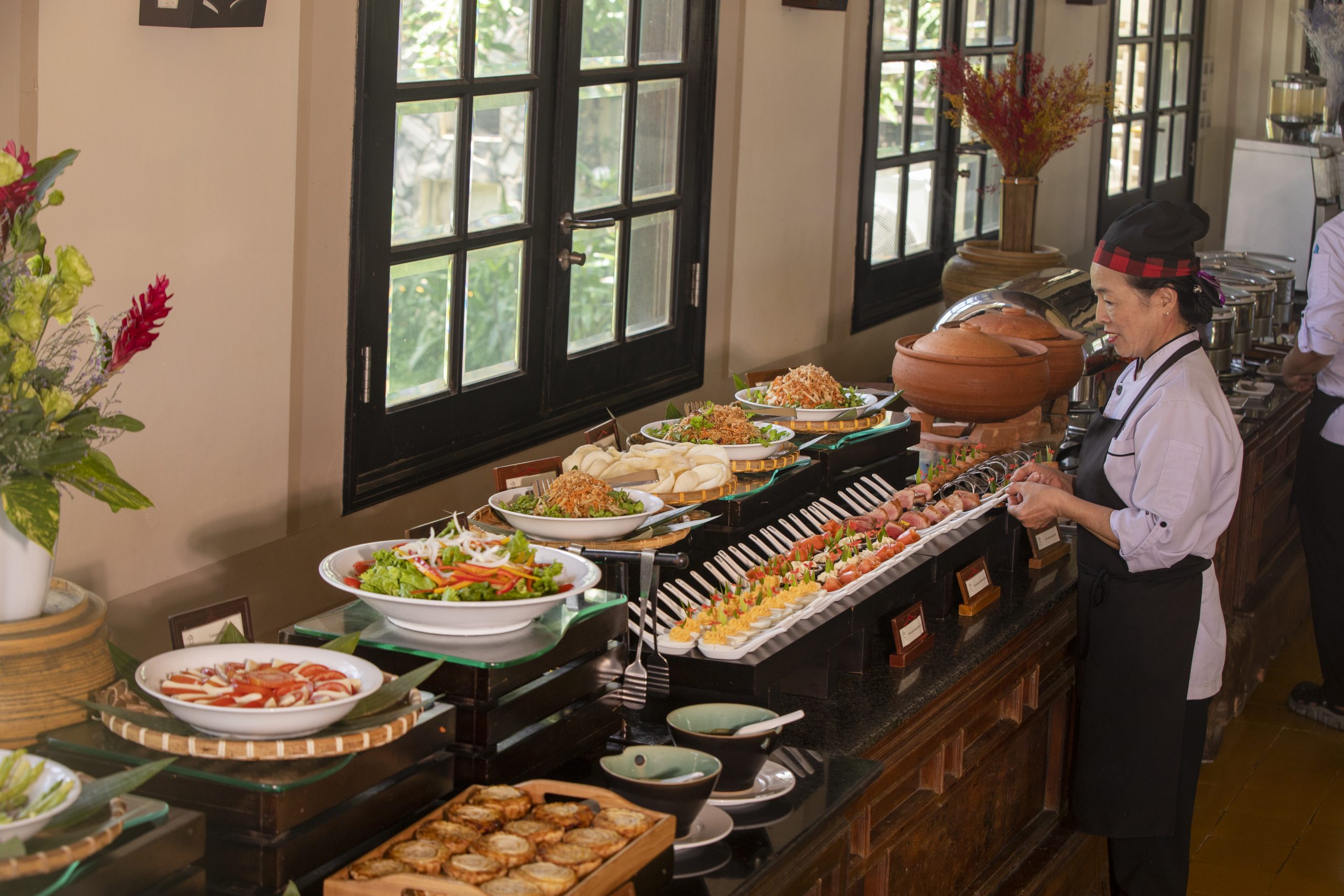 As night falls, the stylish L’Annam Restaurant shines brightly to welcome visitors to the Hoi An Market Buffet, a special culinary event every Tuesday evening at Victoria Hoi An Beach Resort, showcasing the quintessence of Hoi An cuisine.
