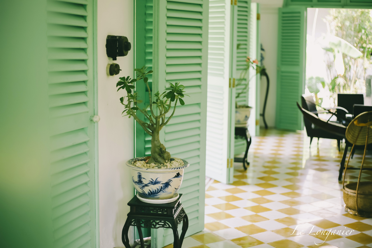 Designed in a classic French architectural style, the two-story Le Longanier Restaurant welcomes visitors through its sage-green plantation doors into a scene from French Indochina, complete with a terracotta roof, artfully stenciled walls and beautifully crafted wooden furniture. Small details complete the nostalgic setting, like a wooden canoe bobbing in the stream nearby, a rustic yoke and vintage accessories.