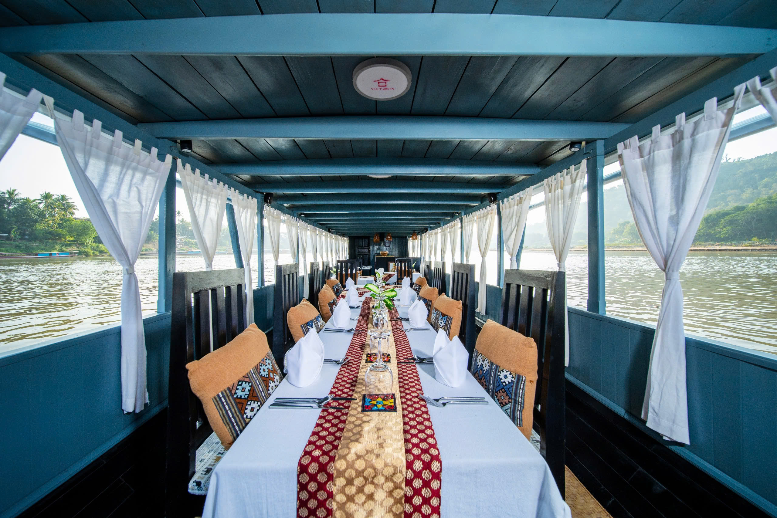 Stepping aboard the Victoria Xiengthong, travelers are greeted by a spacious and elegant setting, inspired by the refined beauty of Lao royal times. Savor delectable local specialties meticulously prepared by our onboard chefs. Sip on refreshing cocktails that sparkle under the fading sunlight and feel the warm caress of the last rays of the day.