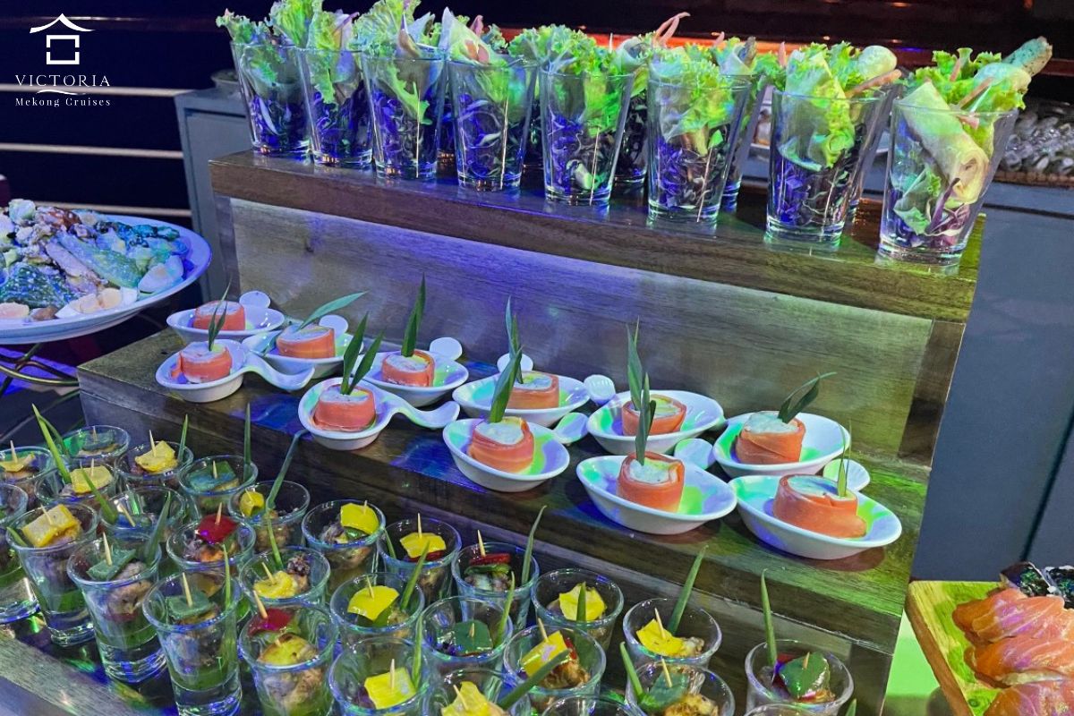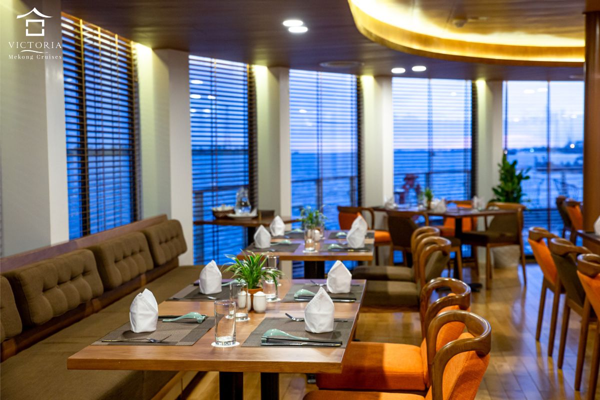 Nhà hàng Claypot sang trọng nằm ở tầng 2 trên du thuyền Victoria Mekong cao 4 tầng cung cấp các món ăn đặc sản vừa mãn nhãn vừa cuốn hút của Việt Nam lẫn quốc tế. Ngoài các bữa tối tại nhà hàng, canapé tối miễn phí hàng đêm, du khách còn có cả một quầy bar để đắm chìm vào hương vị của những ly cocktail thượng hạng trên hải trình khám phá dòng sông Mekong huyền thoại.