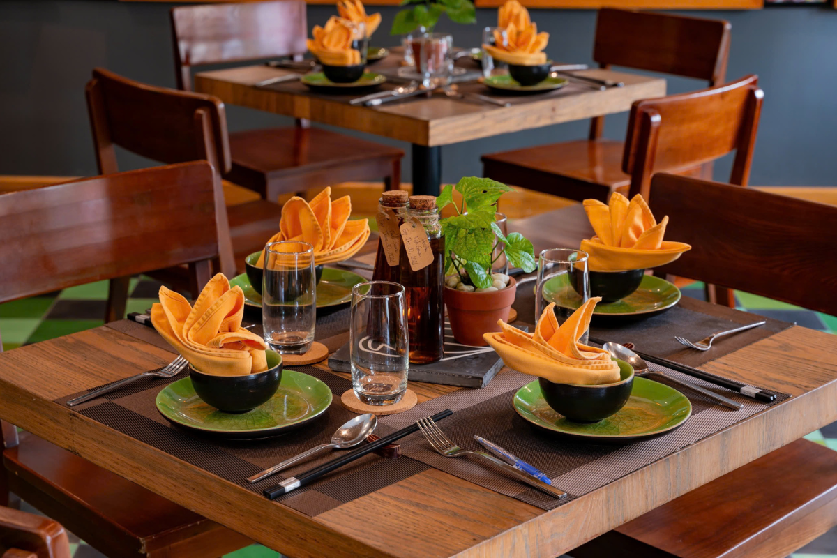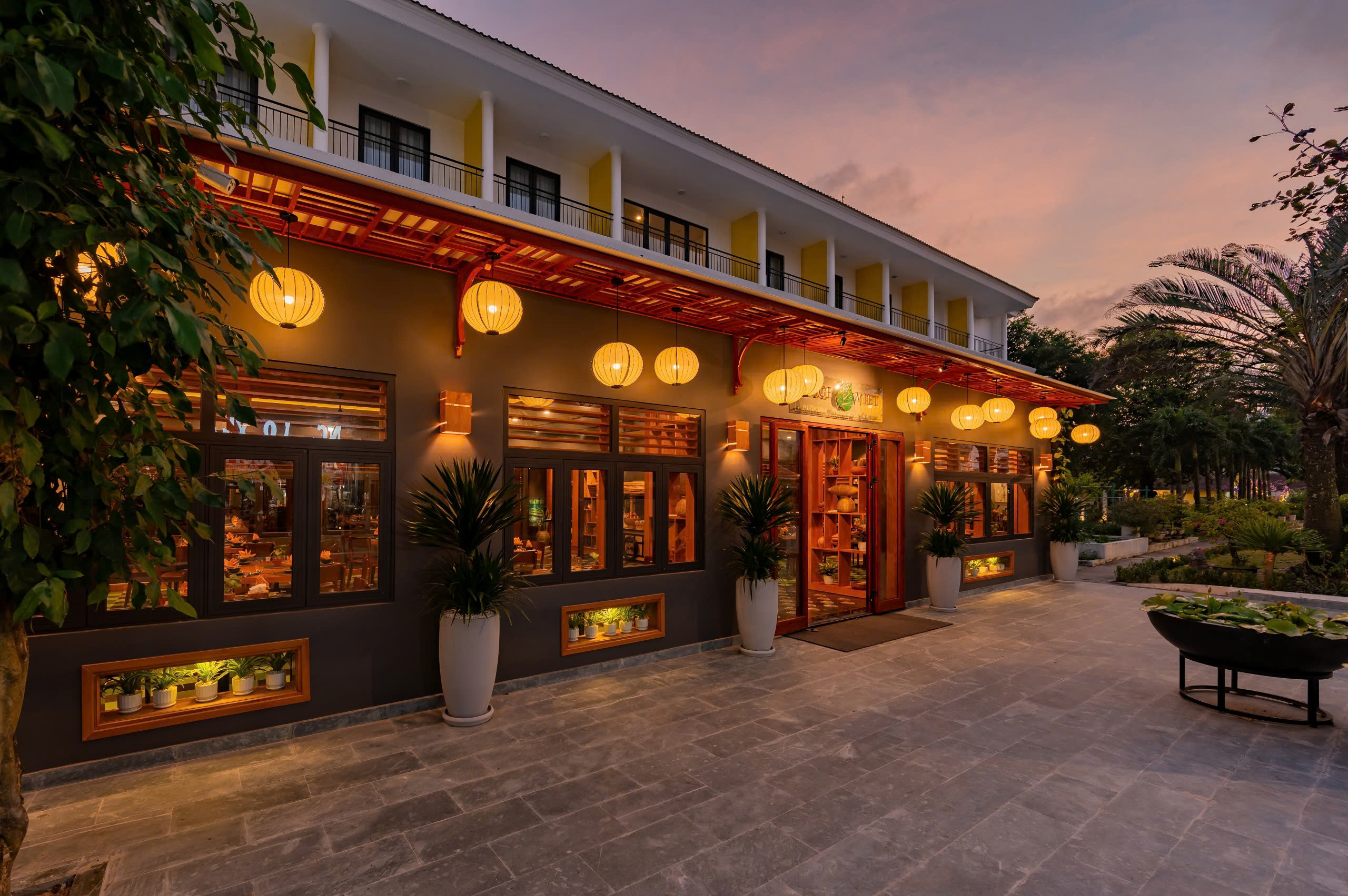 Tấm bình phong mang hình ảnh chiếc lá lốt – biểu tượng của thương hiệu, cùng với chậu hoa súng trước cửa, không chỉ là những điểm nhấn trang trí mà còn mang ý nghĩa phong thủy sâu sắc, mang đến sự may mắn và thịnh vượng. Chất liệu gỗ nâu đỏ và cam kết hợp với dãy đèn lồng treo dưới phần mái nhà đưa ra phía trước cửa tạo ra những rung cảm sâu sắc, gợi nhắc đến hình ảnh của một phố cổ Hội An đã gây thương nhớ biết bao du khách.