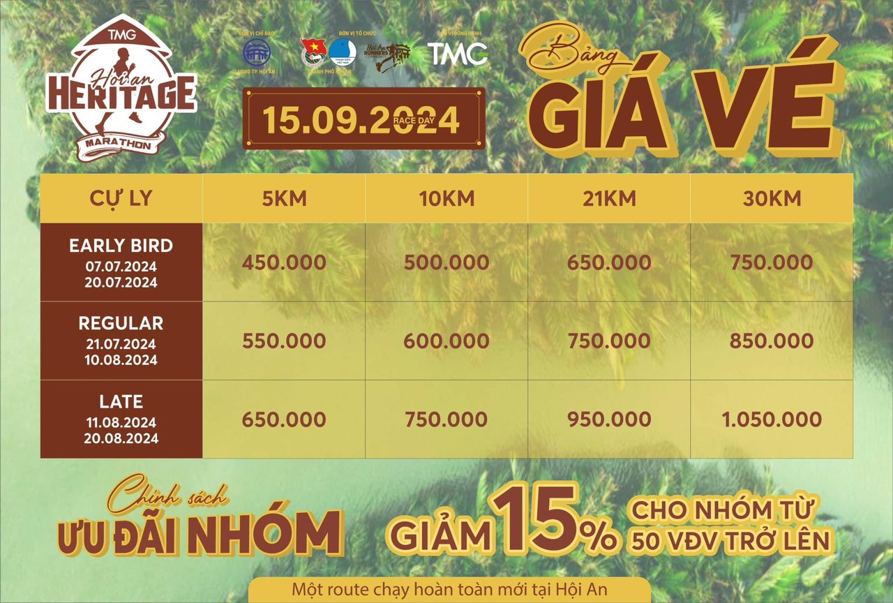 Giải chạy “TMG Hoi An Heritage Marathon 2024” do thành đoàn Hội An và câu lạc bộ địa phương Hoi An Runners Community cùng nhà tài trợ chính Thiên Minh Group (TMG) đồng tổ chức. Giải chạy sẽ diễn ra vào ngày 15/9 với 4 cự ly 5km, 10km, 21km, 30km.