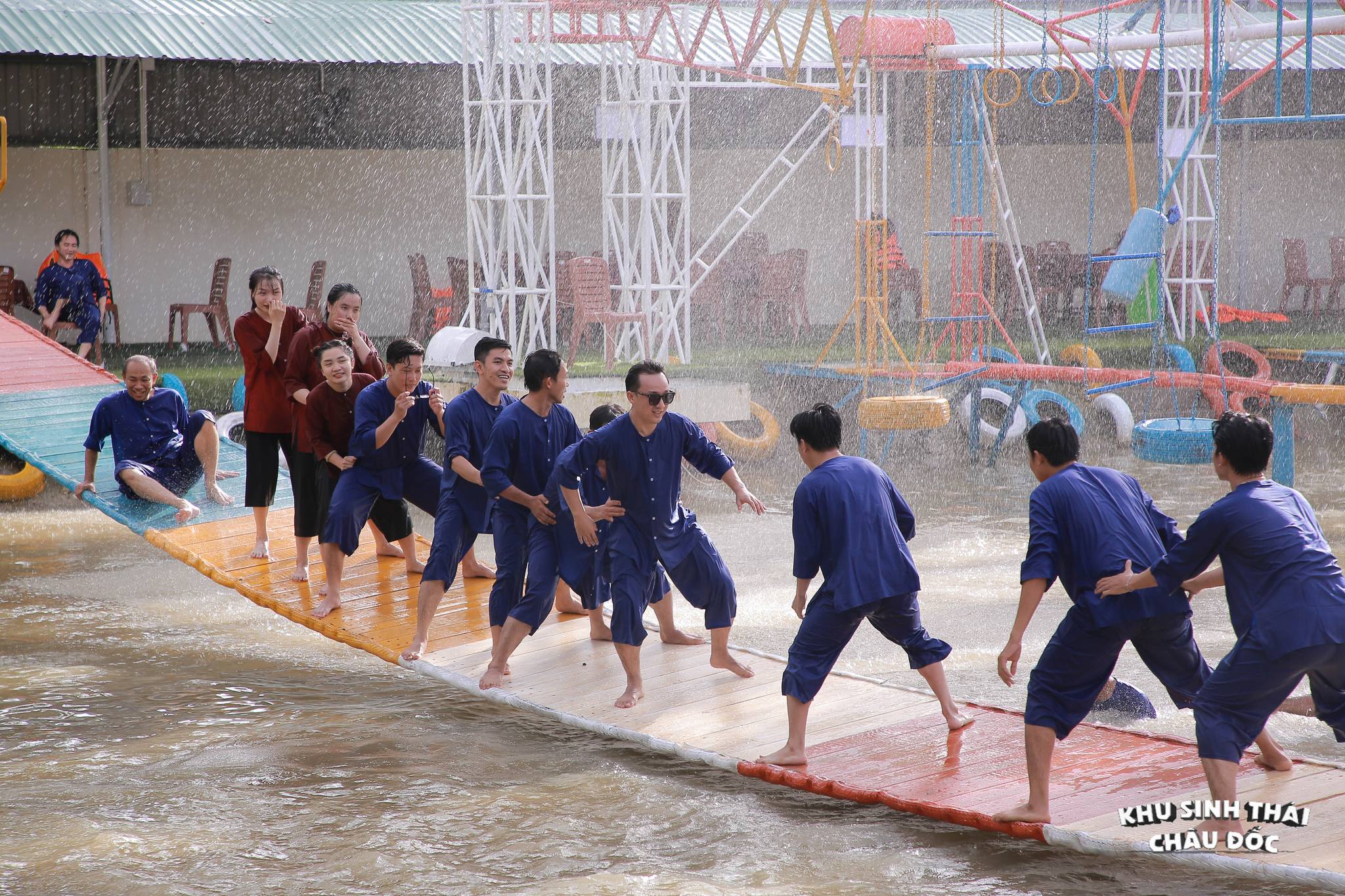 Đây là trò chơi đối kháng mang tính tập thể cao, phù hợp cho các hoạt động team building của công ty, câu lạc bộ, hội, nhóm. Không những vậy, khi tham gia trò này, du khách sẽ được khoác lên mình bộ quần áo bà ba đặc trưng của miền Tây Nam Bộ. Vừa được nghịch nước, vừa được ghi lại những khoảnh khắc vô âu vô lo, cười đùa thích thú bên đồng nghiệp, đó chính là ưu điểm của trò chơi đại chiến cầu lắc thăng bằng trên mặt nước.