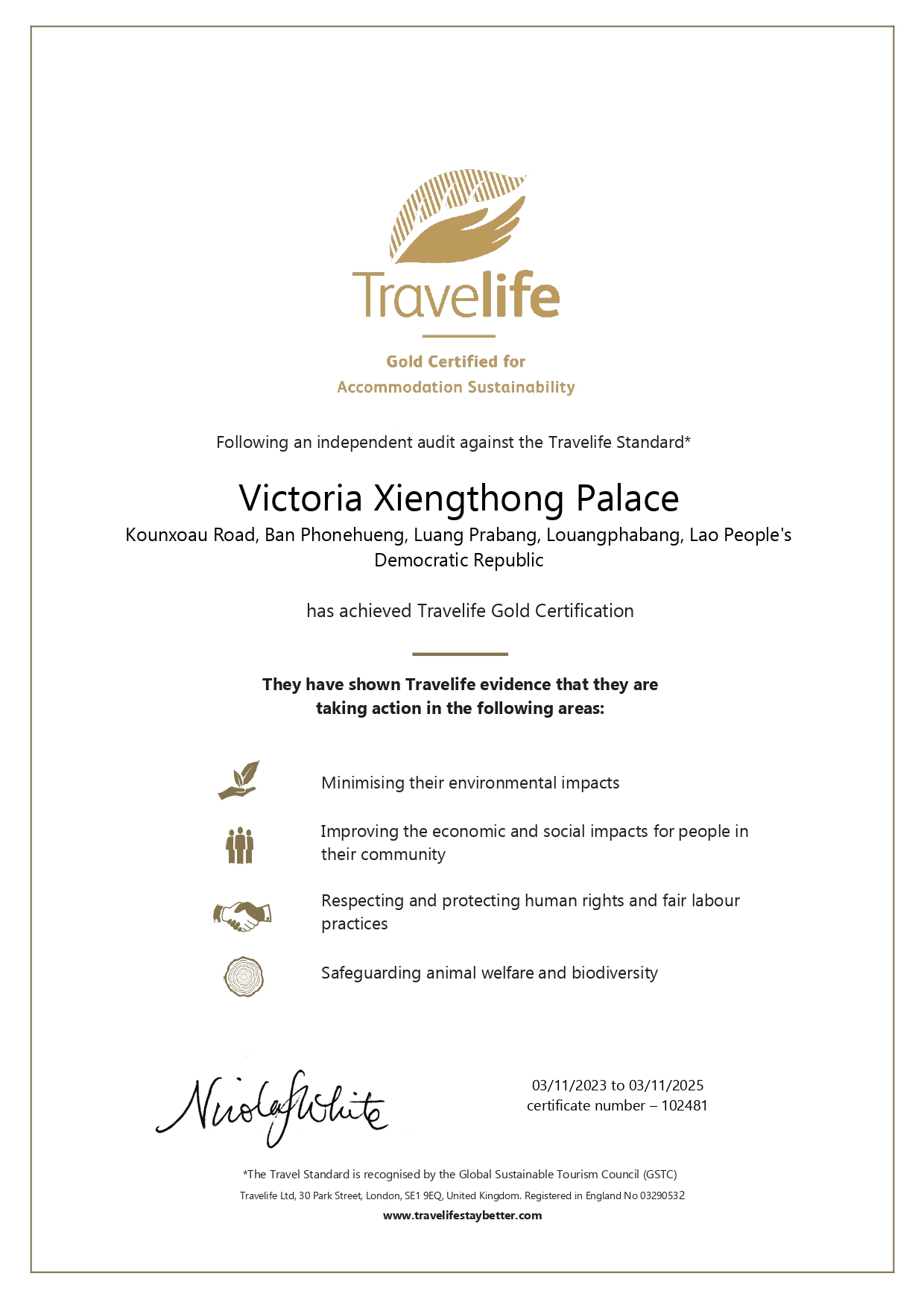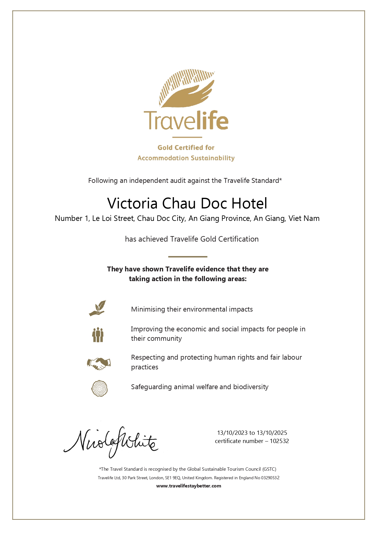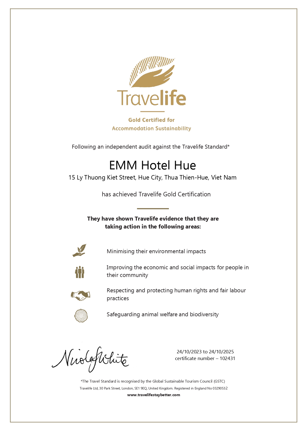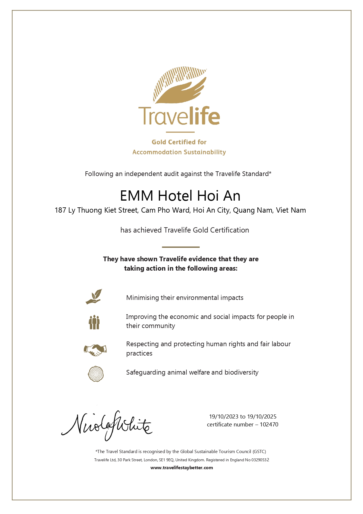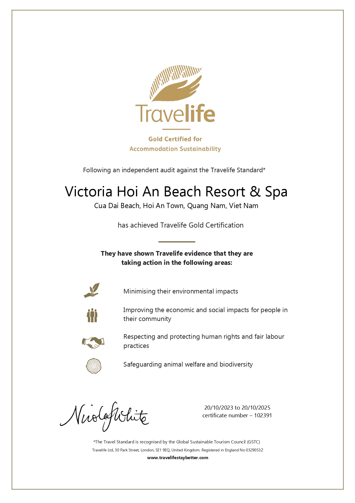 Tiêu chuẩn vàng: Travelife dành cho cơ sở lưu trú là một tổ chức quốc tế danh giá cấp chứng nhận phát triển bền vững cho các khách sạn ở mọi quy mô trên khắp thế giới. Chứng chỉ Travelife Gold áp dụng một bộ tiêu chí toàn diện và khắt khe. Bộ tiêu chí đánh giá của Travelife được Hội đồng Du lịch Bền vững Toàn cầu (GSTC) công nhận. GSTC là đơn vị thiết lập nên các tiêu chuẩn toàn cầu dành cho hoạt động du lịch và lữ hành bền vững.